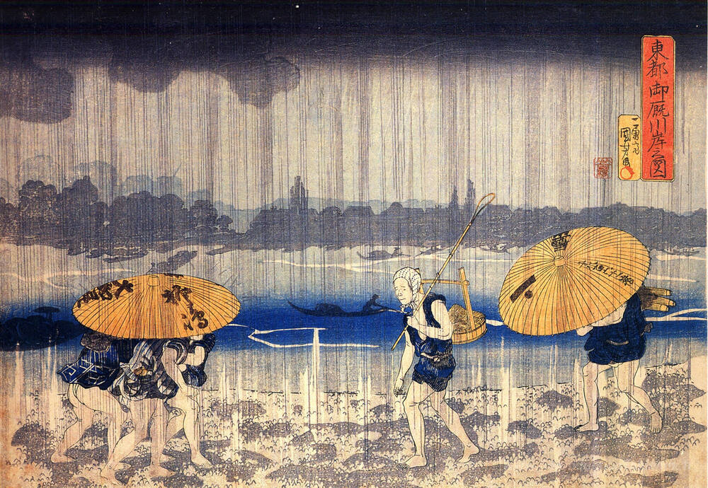 Nous vous proposons une reproduction artisanale sur toile du célèbre tableau 'Forte pluie' de Utagawa Kuniyoshi, provenant du Musée de la Reproduction.