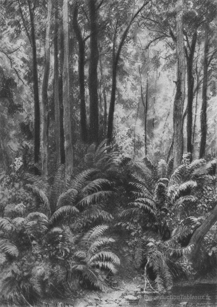 Nous vous proposons une reproduction artisanale sur toile du célèbre tableau 'Fougères dans la forêt' de Ivan Shishkin, provenant du Musée de la Reproduction.