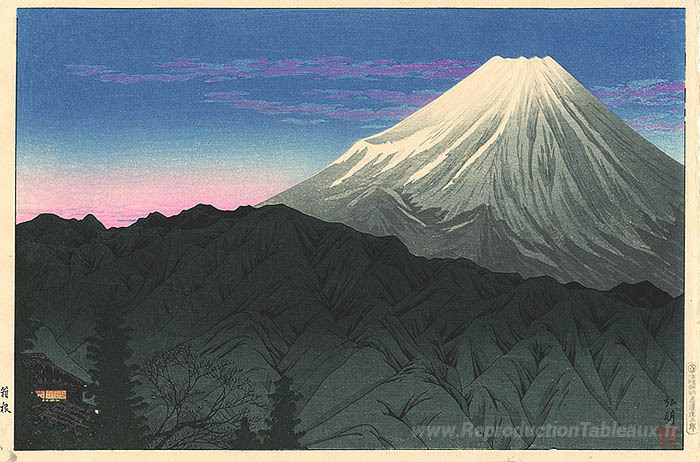 Nous vous proposons une reproduction artisanale sur toile du célèbre tableau 'Fuji de Hakone' de Shotei Takahashi, provenant du Musée de la Reproduction.