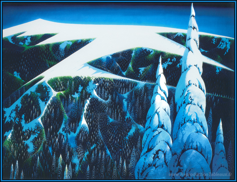 Nous vous proposons une reproduction artisanale sur toile du célèbre tableau 'Gamme Sangre de Cristo' de Eyvind Earle, provenant du Musée de la Reproduction.