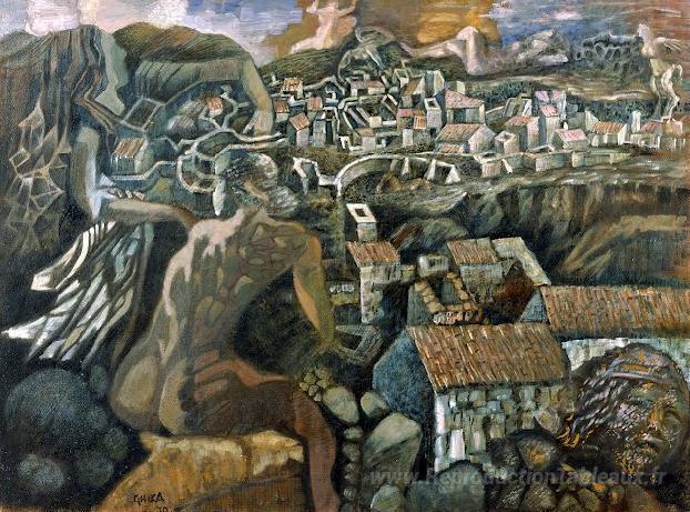 Nous vous proposons une reproduction artisanale sur toile du célèbre tableau 'Genii Loci II' de Nikos Hadjikyriakos-Ghikas, provenant du Musée de la Reproduction.