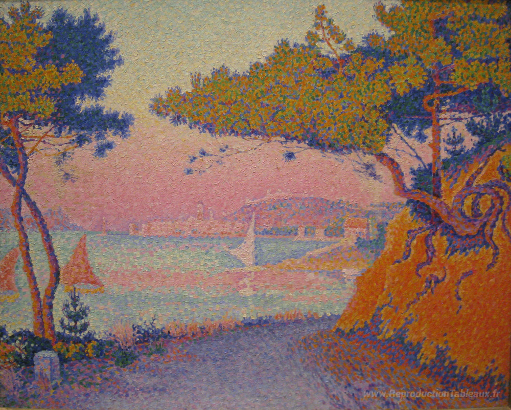 Nous vous proposons une reproduction artisanale sur toile du célèbre tableau 'Golfe Juan' de Paul Signac, provenant du Musée de la Reproduction.