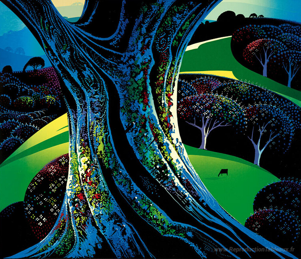 Nous vous proposons une reproduction artisanale sur toile du célèbre tableau 'Grand chêne' de Eyvind Earle, provenant du Musée de la Reproduction.