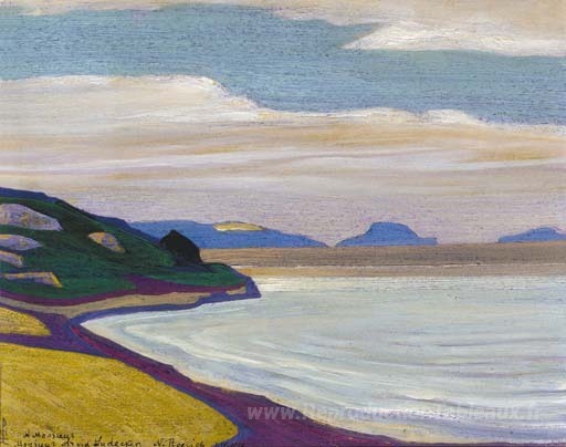 Nous vous proposons une reproduction artisanale sur toile du célèbre tableau 'Grand Vista sur un paysage côtier' de Nicholas Roerich, provenant du Musée de la Reproduction.