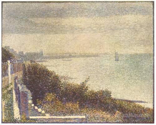 Nous vous proposons une reproduction artisanale sur toile du célèbre tableau 'Grandcamp, soirée' de Georges Seurat, provenant du Musée de la Reproduction.