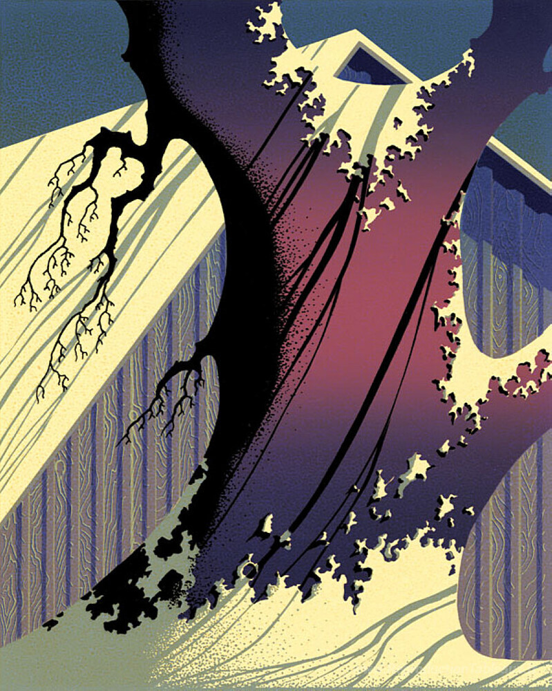 Nous vous proposons une reproduction artisanale sur toile du célèbre tableau 'Grange mauve' de Eyvind Earle, provenant du Musée de la Reproduction.