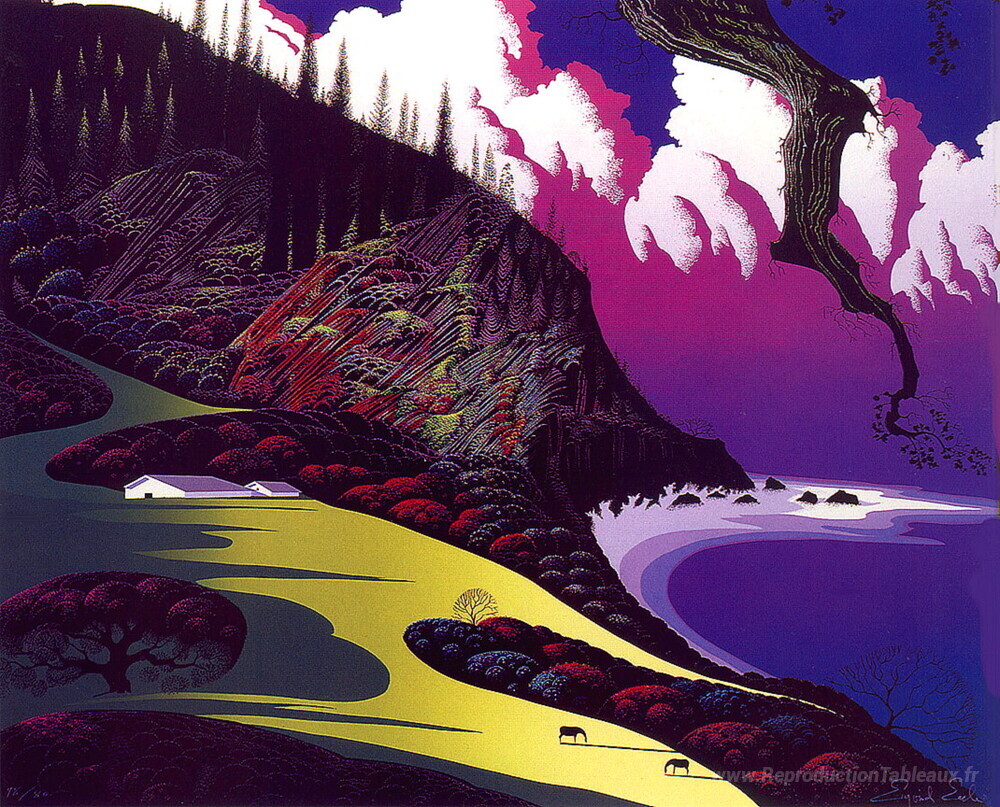 Nous vous proposons une reproduction artisanale sur toile du célèbre tableau 'Granges au bord de la mer' de Eyvind Earle, provenant du Musée de la Reproduction.