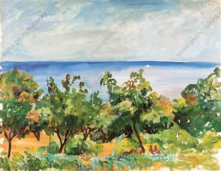 Nous vous proposons une reproduction artisanale sur toile du célèbre tableau 'Gurzuf. Les arbres en arrière-plan de la mer.' de Pyotr Konchalovsky, provenant du Musée de la Reproduction.