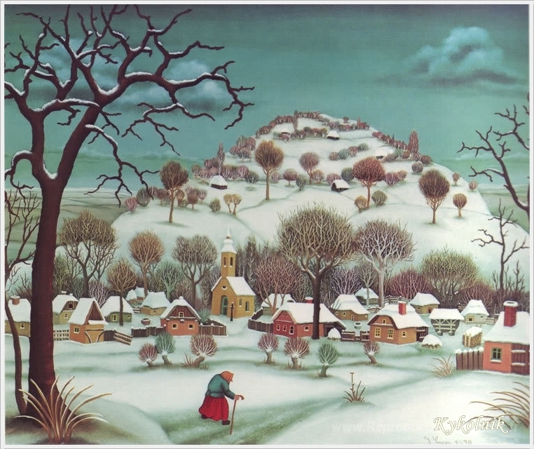 Nous vous proposons une reproduction artisanale sur toile du célèbre tableau 'Hiver dans le village' de Ivan Generalic, provenant du Musée de la Reproduction.