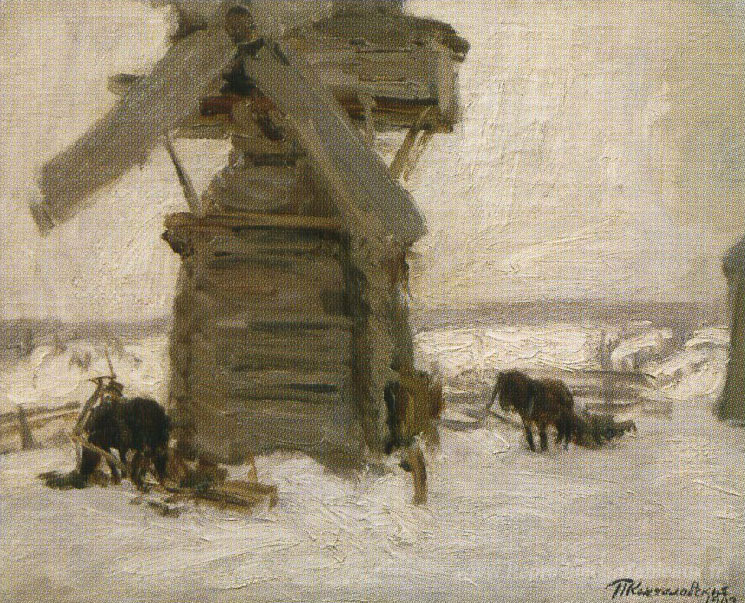 Nous vous proposons une reproduction artisanale sur toile du célèbre tableau 'Hiver. Le moulin sur l'île Ker.' de Pyotr Konchalovsky, provenant du Musée de la Reproduction.