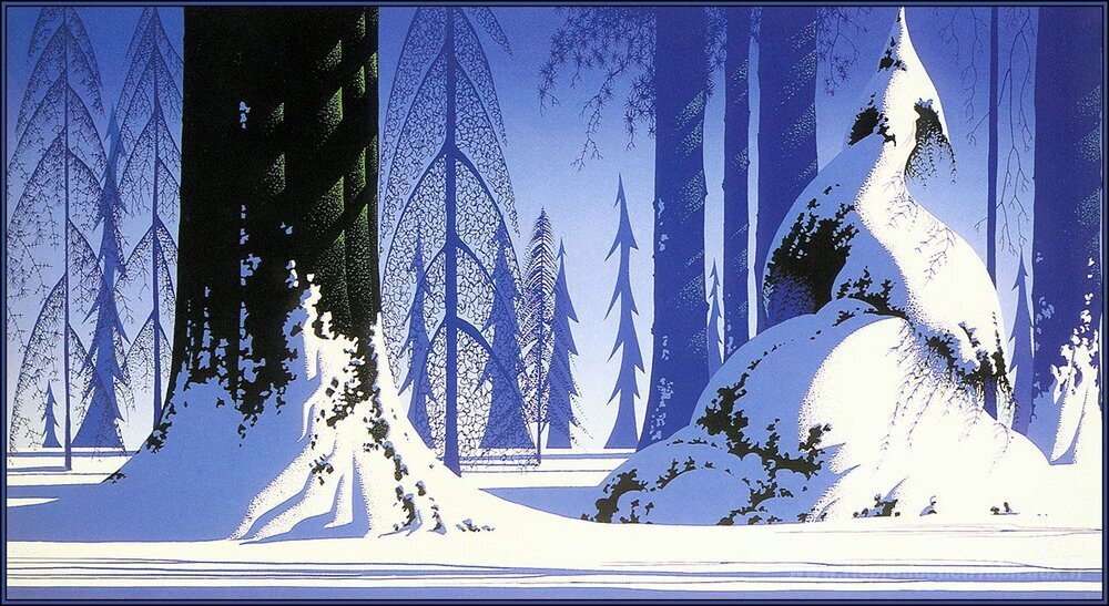 Nous vous proposons une reproduction artisanale sur toile du célèbre tableau 'Hiver' de Eyvind Earle, provenant du Musée de la Reproduction.