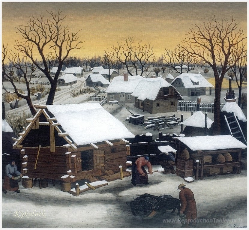Nous vous proposons une reproduction artisanale sur toile du célèbre tableau 'Hiver' de Ivan Generalic, provenant du Musée de la Reproduction.