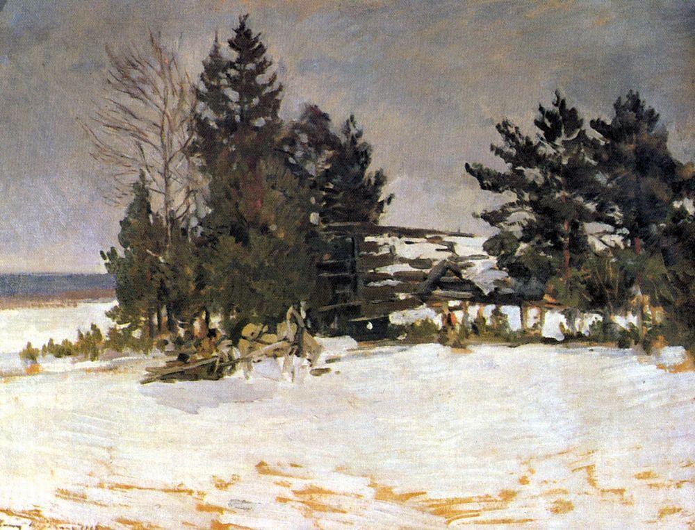 Nous vous proposons une reproduction artisanale sur toile du célèbre tableau 'Hiver' de Konstantin Korovin, provenant du Musée de la Reproduction.