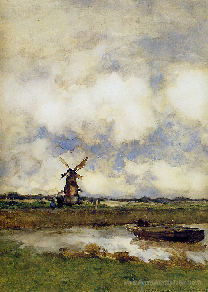Nous vous proposons une reproduction artisanale sur toile du célèbre tableau 'Homme dans un bateau dans un canal' de Johan Hendrik Weissenbruch, provenant du Musée de la Reproduction.