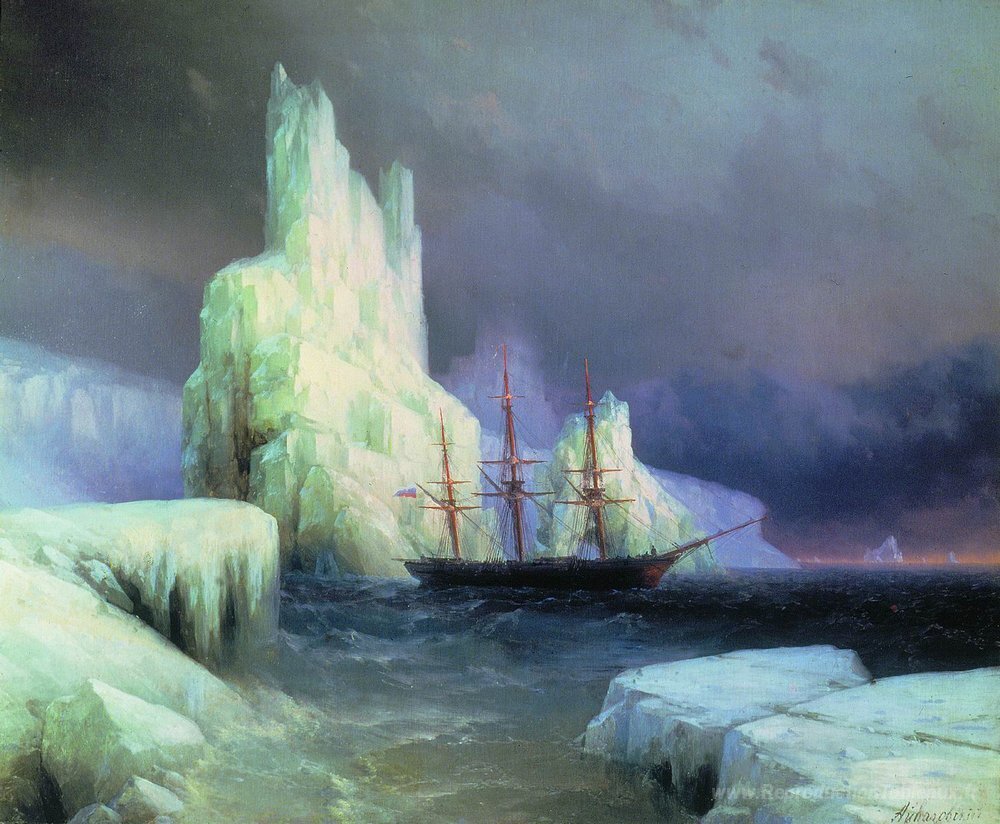 Nous vous proposons une reproduction artisanale sur toile du célèbre tableau 'Icebergs dans l'Atlantique' de Ivan Aivazovsky, provenant du Musée de la Reproduction.