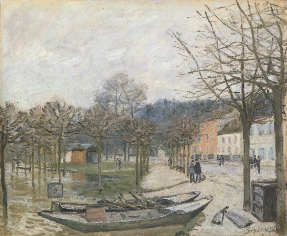 Nous vous proposons une reproduction artisanale sur toile du célèbre tableau 'Inondation à Port Marly' de Alfred Sisley, provenant du Musée de la Reproduction.