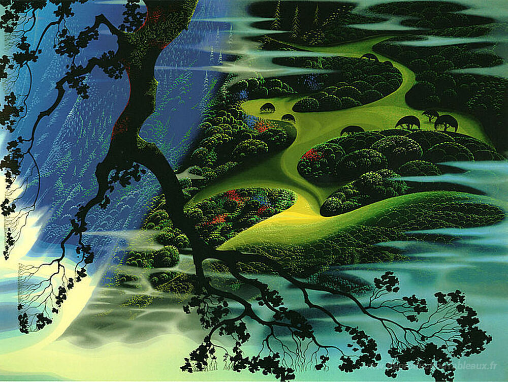 Nous vous proposons une reproduction artisanale sur toile du célèbre tableau 'La beauté se brise à l'aube' de Eyvind Earle, provenant du Musée de la Reproduction.