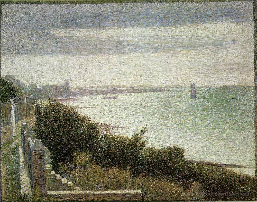 Nous vous proposons une reproduction artisanale sur toile du célèbre tableau 'La chaîne anglaise de Grandcamp' de Georges Seurat, provenant du Musée de la Reproduction.