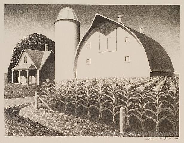 Nous vous proposons une reproduction artisanale sur toile du célèbre tableau 'La fertilité' de Grant Wood, provenant du Musée de la Reproduction.