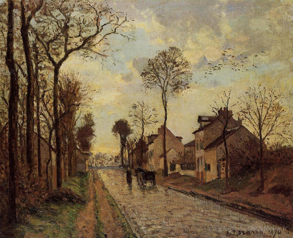 Nous vous proposons une reproduction artisanale sur toile du célèbre tableau 'La route des Louvèciens' de Camille Pissarro, provenant du Musée de la Reproduction.
