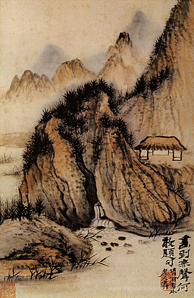 Nous vous proposons une reproduction artisanale sur toile du célèbre tableau 'La source dans le creux du rocher' de Shitao, provenant du Musée de la Reproduction.