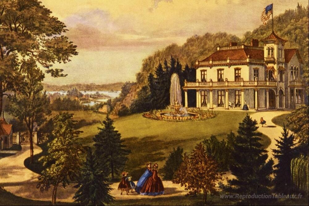 Nous vous proposons une reproduction artisanale sur toile du célèbre tableau 'La vie dans le pays - le soir' de Currier and Ives, provenant du Musée de la Reproduction.
