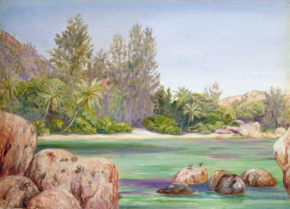 Nous vous proposons une reproduction artisanale sur toile du célèbre tableau 'La vie sur la côte de Praslin, Seychelles' de Marianne North, provenant du Musée de la Reproduction.