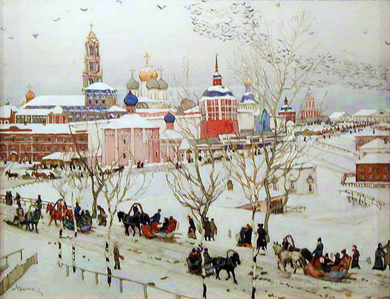 Nous vous proposons une reproduction artisanale sur toile du célèbre tableau 'La vue du monastère à la rue Vokzalnaya' de Konstantin Yuon, provenant du Musée de la Reproduction.