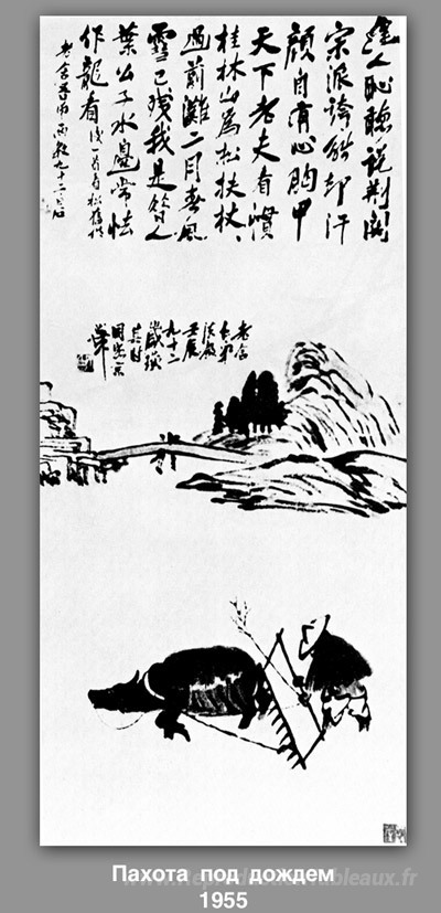Nous vous proposons une reproduction artisanale sur toile du célèbre tableau 'Labourer sous la pluie' de Qi Baishi, provenant du Musée de la Reproduction.