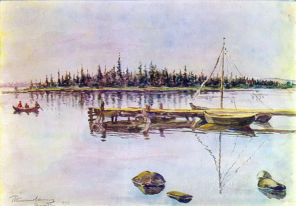 Nous vous proposons une reproduction artisanale sur toile du célèbre tableau 'Lac Imandra. NETS de résinification.' de Pyotr Konchalovsky, provenant du Musée de la Reproduction.