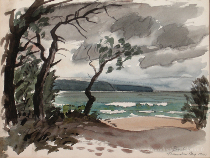 Nous vous proposons une reproduction artisanale sur toile du célèbre tableau 'Lac Superior près de Thunder Bay' de Jack Bush, provenant du Musée de la Reproduction.