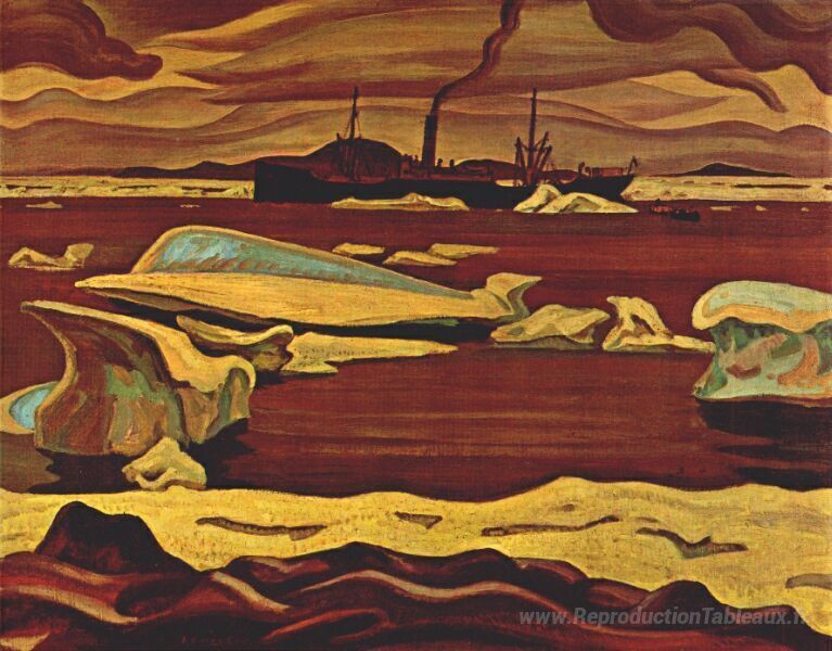Nous vous proposons une reproduction artisanale sur toile du célèbre tableau 'Le Beothic à Bache Post, Ellesmere Island' de A.Y. Jackson, provenant du Musée de la Reproduction.