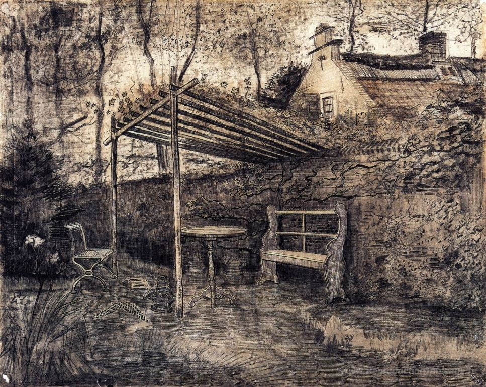 Nous vous proposons une reproduction artisanale sur toile du célèbre tableau 'Le jardin du presbytère avec une tonnelle' de Vincent van Gogh, provenant du Musée de la Reproduction.