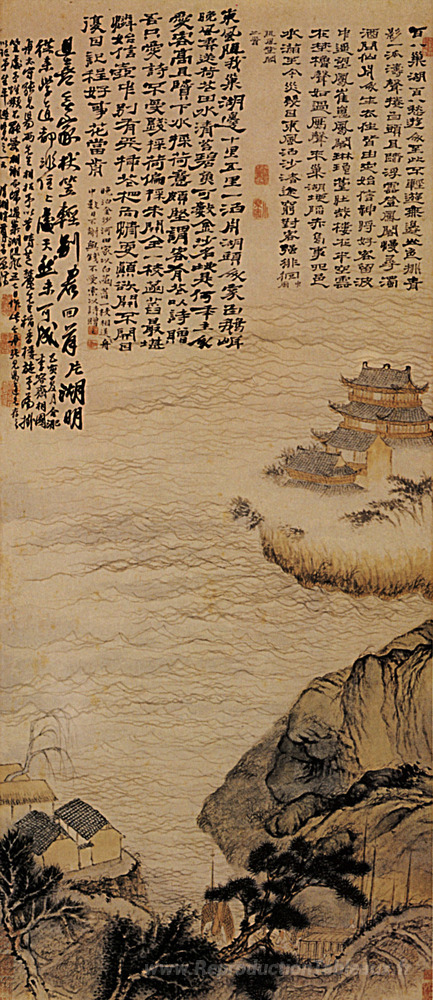 Nous vous proposons une reproduction artisanale sur toile du célèbre tableau 'Le lac Cao' de Shitao, provenant du Musée de la Reproduction.