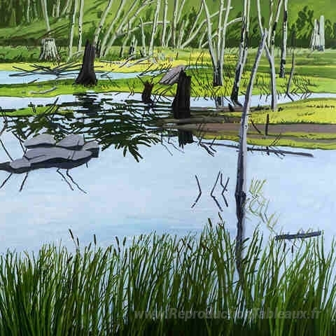 Nous vous proposons une reproduction artisanale sur toile du célèbre tableau 'Le marais de Joanna' de Neil Welliver, provenant du Musée de la Reproduction.