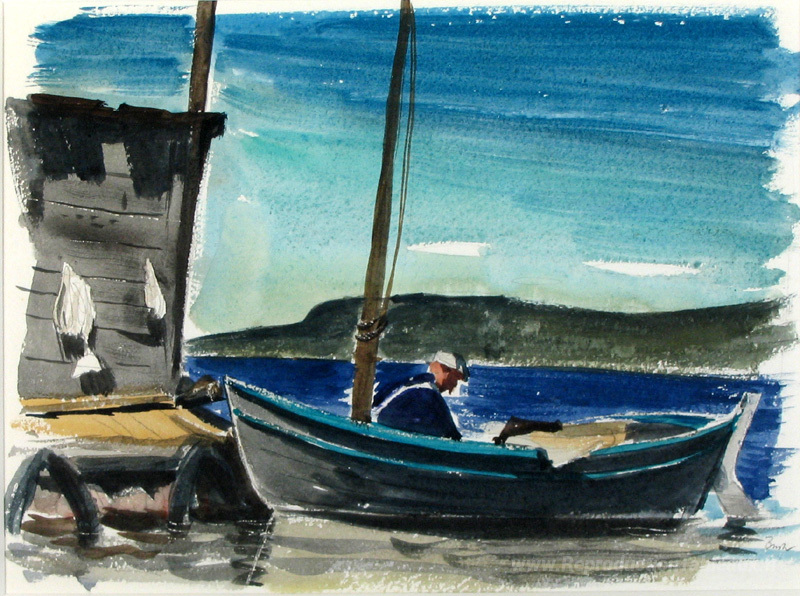 Nous vous proposons une reproduction artisanale sur toile du célèbre tableau 'Le pêcheur' de Jack Bush, provenant du Musée de la Reproduction.