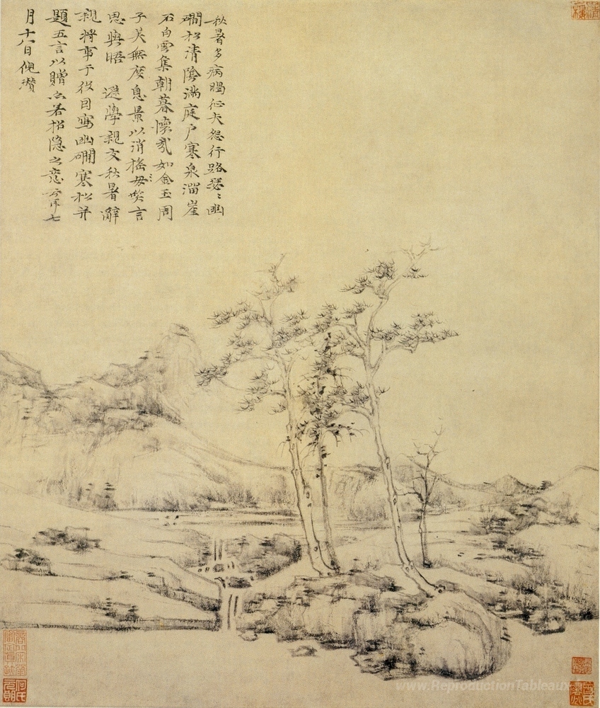 Nous vous proposons une reproduction artisanale sur toile du célèbre tableau 'Le pin à écoulement froid lointain' de Ni Zan, provenant du Musée de la Reproduction.