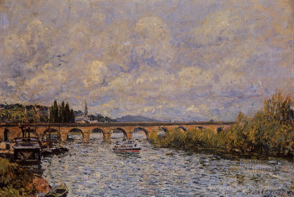 Nous vous proposons une reproduction artisanale sur toile du célèbre tableau 'Le pont Sevres' de Alfred Sisley, provenant du Musée de la Reproduction.