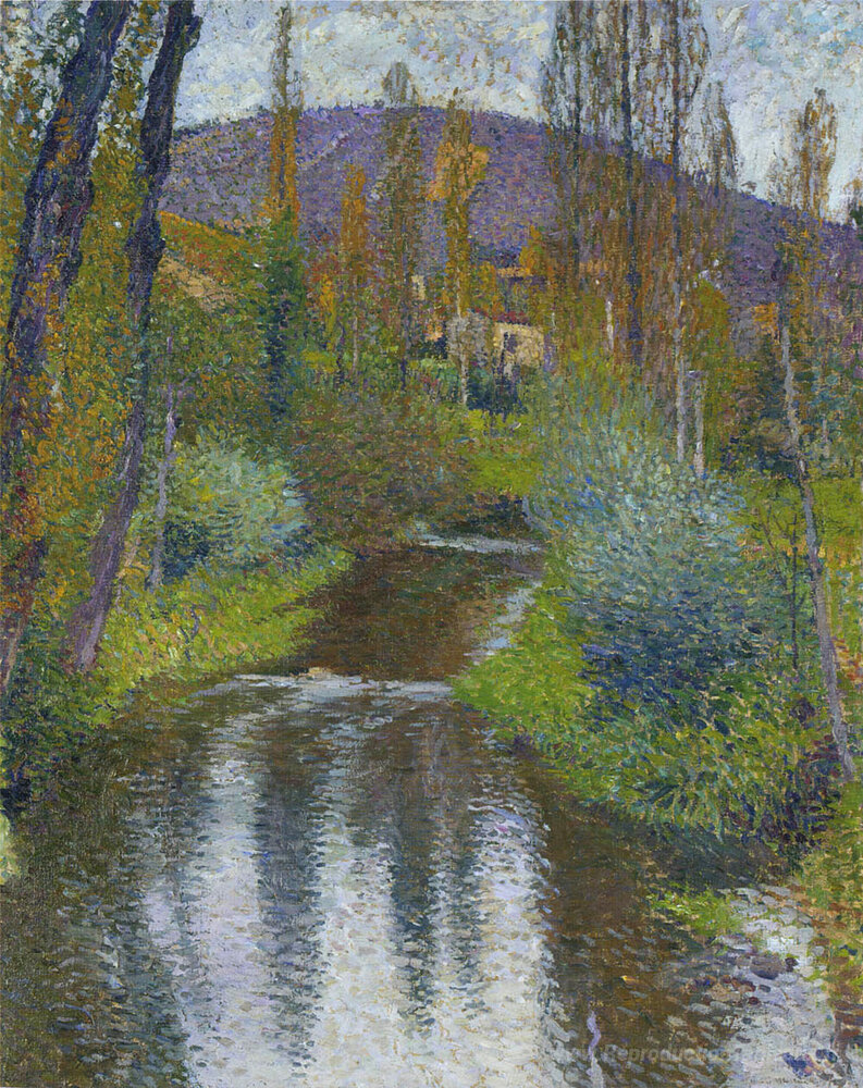 Nous vous proposons une reproduction artisanale sur toile du célèbre tableau 'Le vert et les premières maisons de Labastide' de Henri Martin, provenant du Musée de la Reproduction.