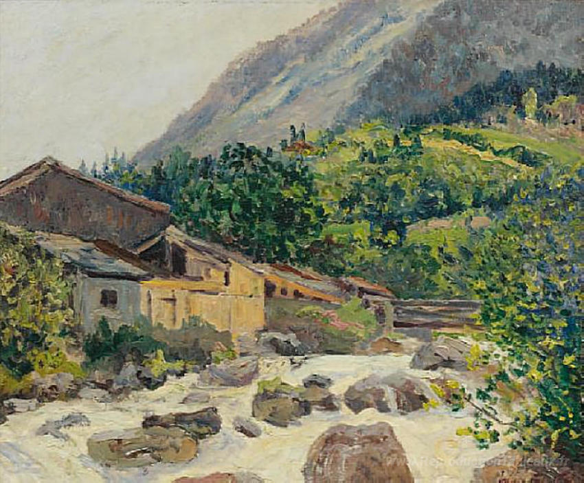 Nous vous proposons une reproduction artisanale sur toile du célèbre tableau 'Le village sur la rivière, Bozel' de Maxime Maufra, provenant du Musée de la Reproduction.
