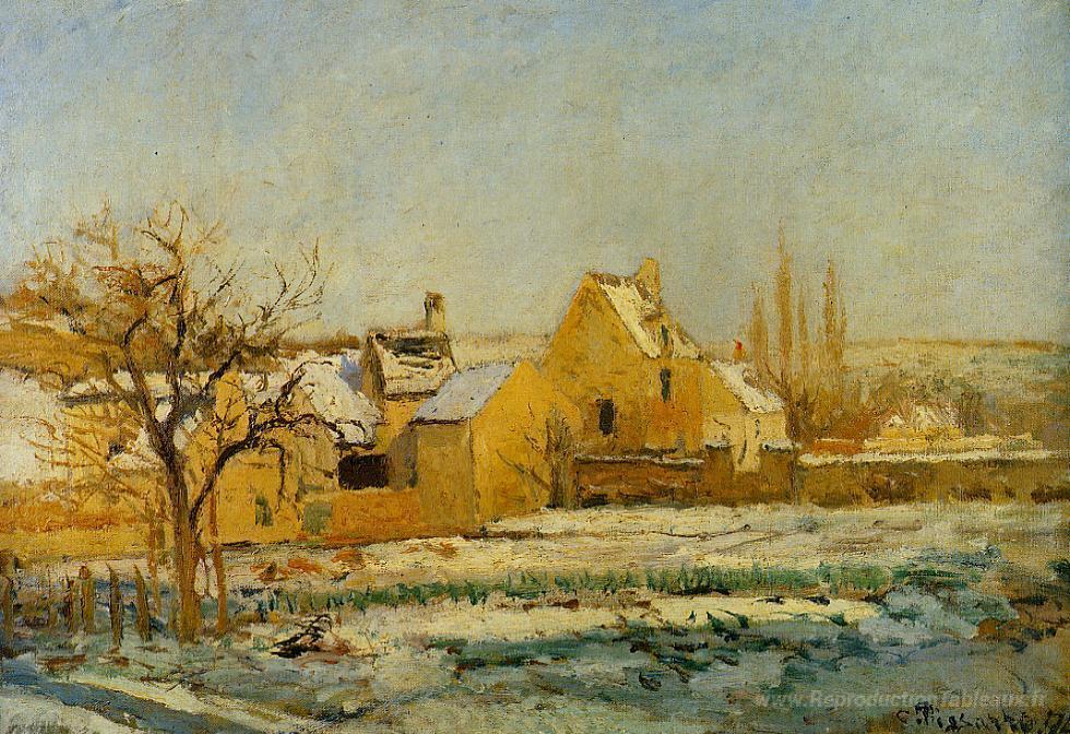 Nous vous proposons une reproduction artisanale sur toile du célèbre tableau 'L'effet de la neige à l'Hermitage' de Camille Pissarro, provenant du Musée de la Reproduction.