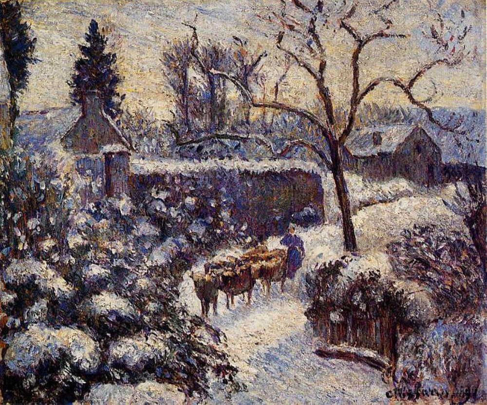 Nous vous proposons une reproduction artisanale sur toile du célèbre tableau 'L'effet de la neige à Montfoucault' de Camille Pissarro, provenant du Musée de la Reproduction.