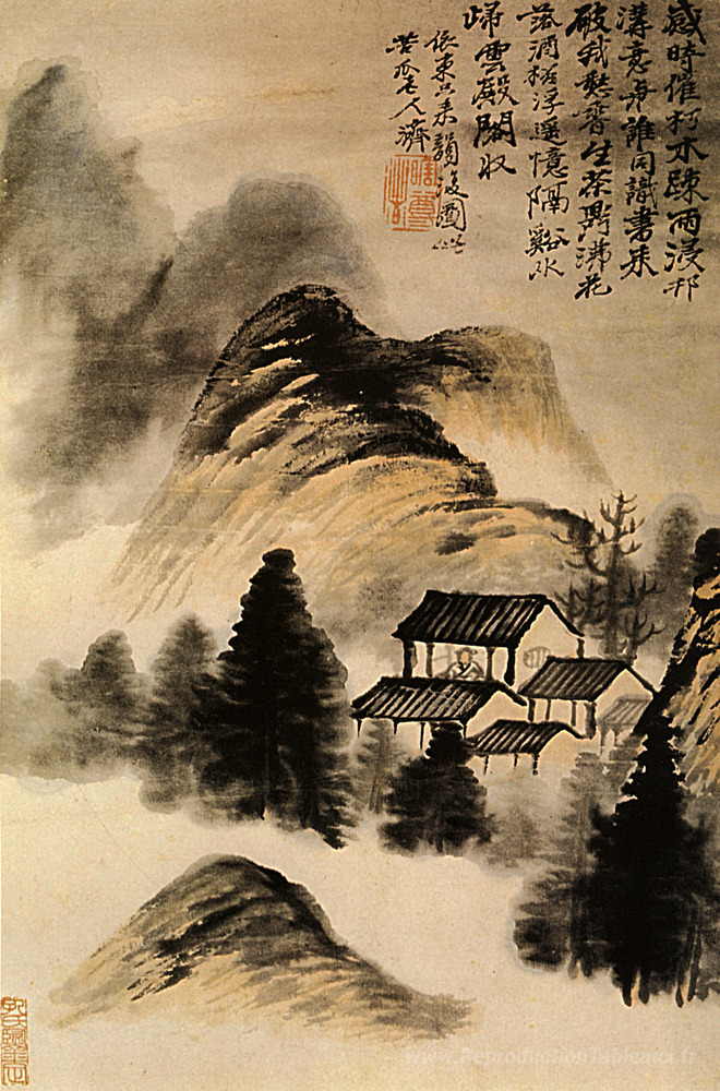 Nous vous proposons une reproduction artisanale sur toile du célèbre tableau 'L'ermite Lodge au milieu de la table' de Shitao, provenant du Musée de la Reproduction.