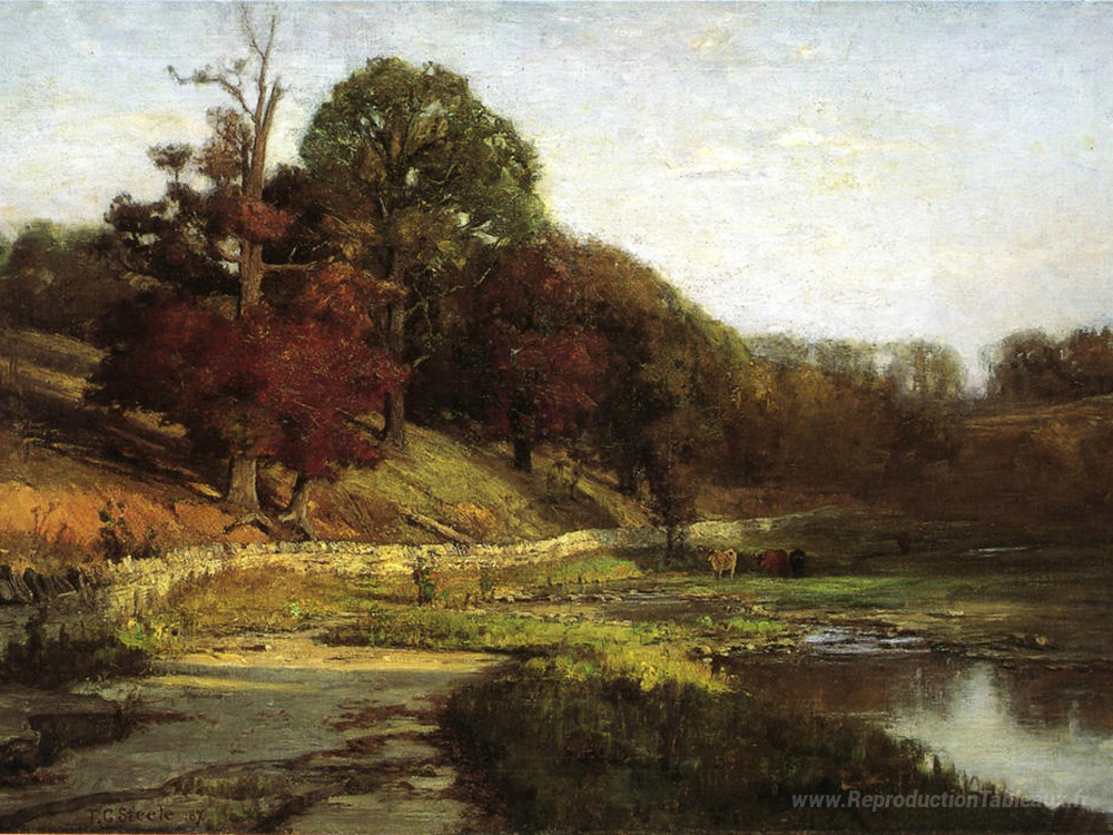 Nous vous proposons une reproduction artisanale sur toile du célèbre tableau 'Les chênes de Vernon' de T. C. Steele, provenant du Musée de la Reproduction.