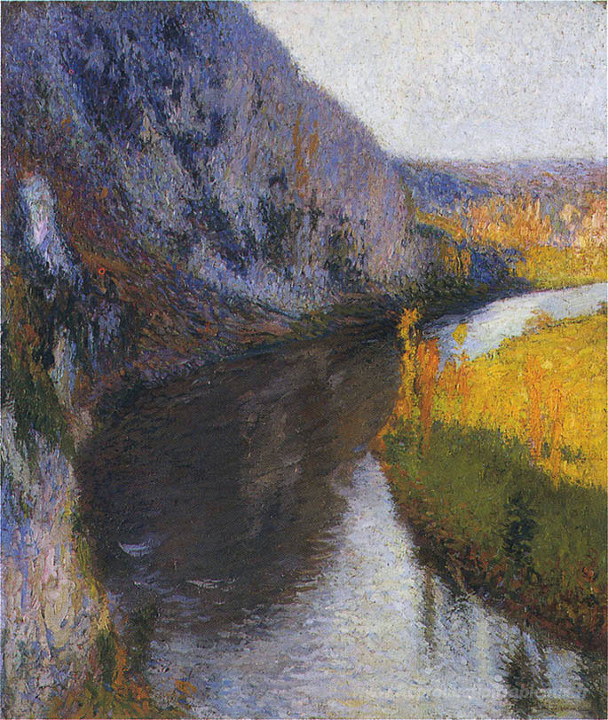 Nous vous proposons une reproduction artisanale sur toile du célèbre tableau 'Les falaises de lot' de Henri Martin, provenant du Musée de la Reproduction.