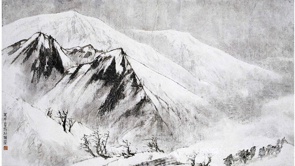 Nous vous proposons une reproduction artisanale sur toile du célèbre tableau 'Les neiges lointaines de Minshan ne font que nous heureux' de Fu Baoshi, provenant du Musée de la Reproduction.