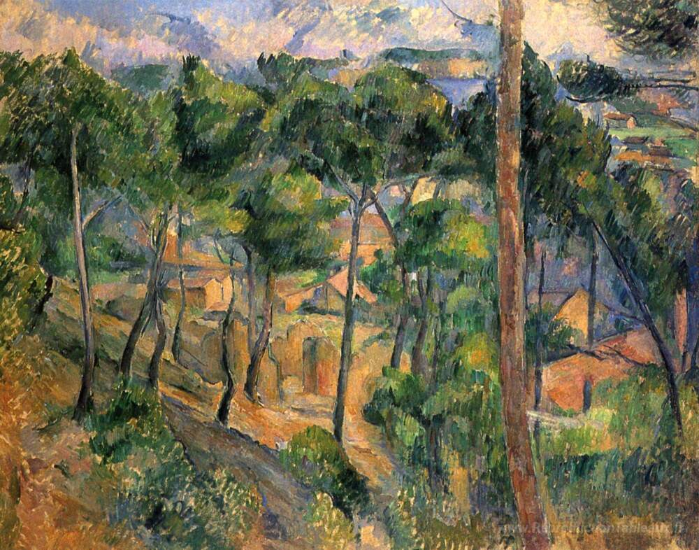 Nous vous proposons une reproduction artisanale sur toile du célèbre tableau 'L'estaque vue à travers les pins' de Paul Cezanne, provenant du Musée de la Reproduction.