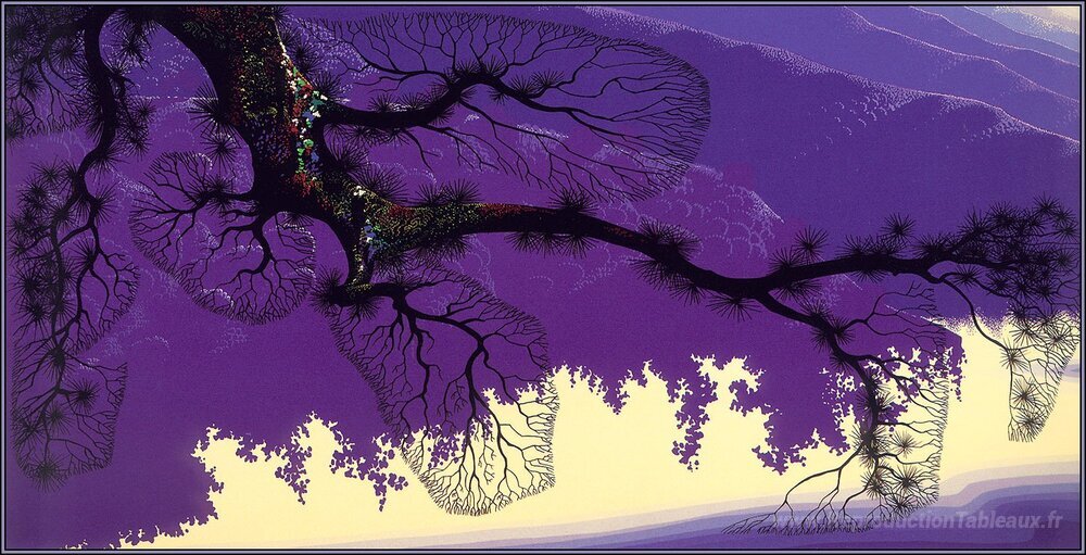 Nous vous proposons une reproduction artisanale sur toile du célèbre tableau 'Littoral violet' de Eyvind Earle, provenant du Musée de la Reproduction.