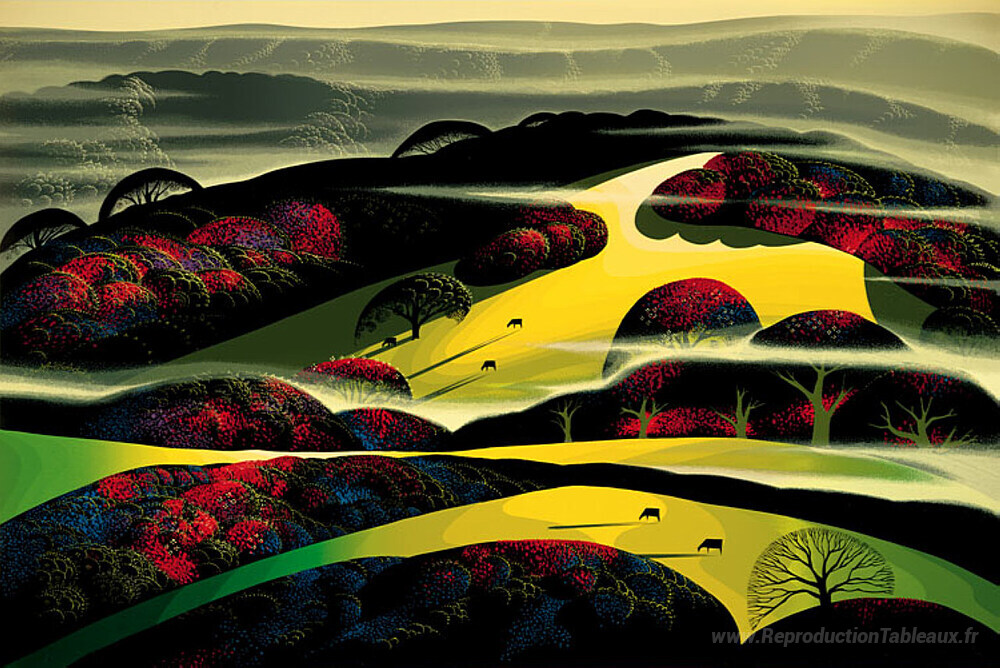 Nous vous proposons une reproduction artisanale sur toile du célèbre tableau 'Loma Amarillo' de Eyvind Earle, provenant du Musée de la Reproduction.