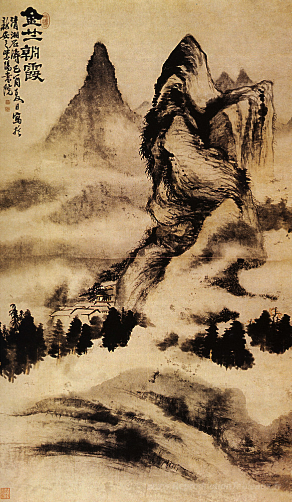 Nous vous proposons une reproduction artisanale sur toile du célèbre tableau 'Lumière de l'aube sur le monastère' de Shitao, provenant du Musée de la Reproduction.